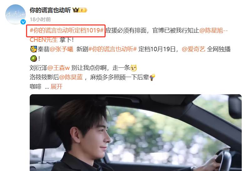 《你的谎言也动听》改编自同名小说,讲述了医疗救援队的医生行知止(陈星旭饰)与志愿者秦翡(张予曦饰)在灾区相识。