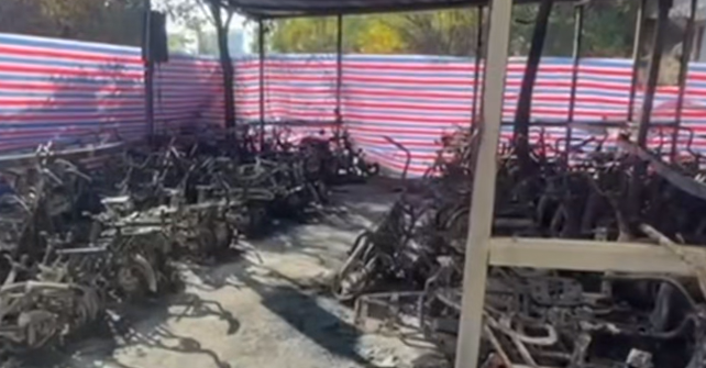 2024年10月21日,山西省太原市,一高校电动自行车在夜间充电时发生自燃,短短几分钟内火势迅速蔓延,不时传来爆炸的声音,消防救援人员到场后及时扑灭明火,所幸无人员伤亡。