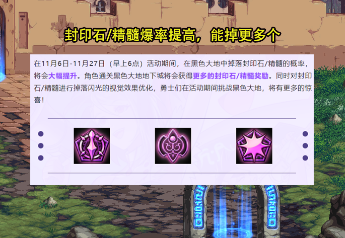黑色大地小屋是获得黑色大地相关产物的一个活动活动从11.6开启。在活动期间,刷黑色大地封印石/精髓的概率会大幅度提升,同时获得数量也会得到上调,另外还存在惊喜,就是不知道会是什么了。