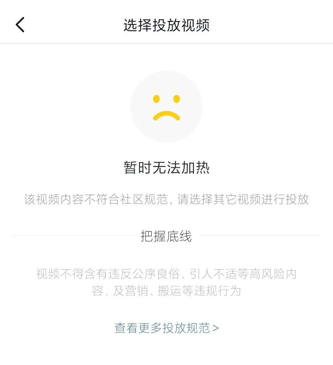 可以对视频作品投放dou+来检测作品违规情况。如果该视频出现“暂时无法加热”的提示,那就表明出问题了。