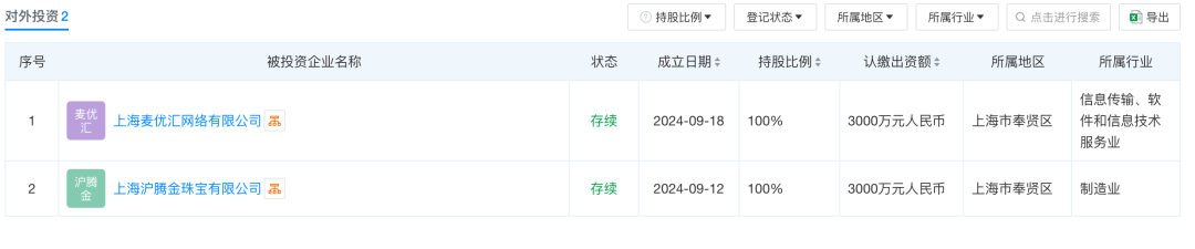 天眼查显示,麦多多隶属上海麦个购网络科技有限公司,成立于2024年4月23日,注册资本1500万元,法定代表人陈凯文,注册地在上海,经营范围为互联网销售;服装服饰批发;鞋帽批发与零售;珠宝首饰批发;化妆品批发;个人互联网直播服务等。旗下拥有上海麦优汇网络有限公司、上海沪腾金珠宝有限公司这两家全资子公司,目前这三家公司均处于存续状态。