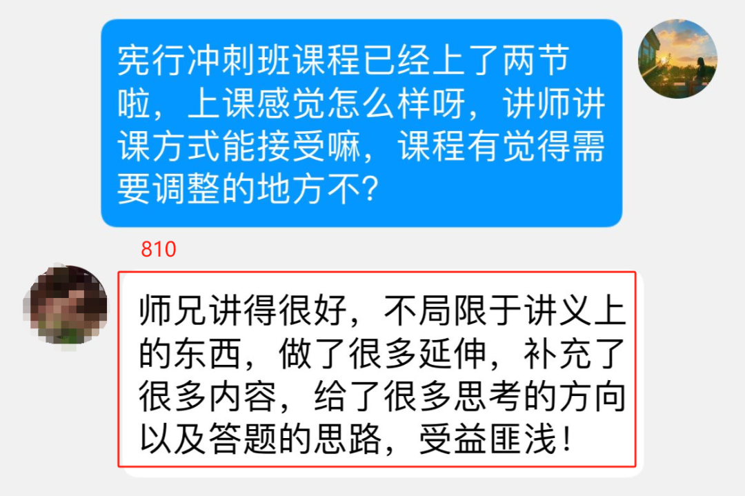 ②授课优势:硕士期间持续进行理论学习与课题研究,对学理研究较为深入的同时,擅长应试技巧讲授,对知识点可以进行深度、广度的扩展,也可以以题目进行全梳理,带领同学们真正实现“背诵”到“应试”的突破,实现“知识点”到“题目”的飞跃。