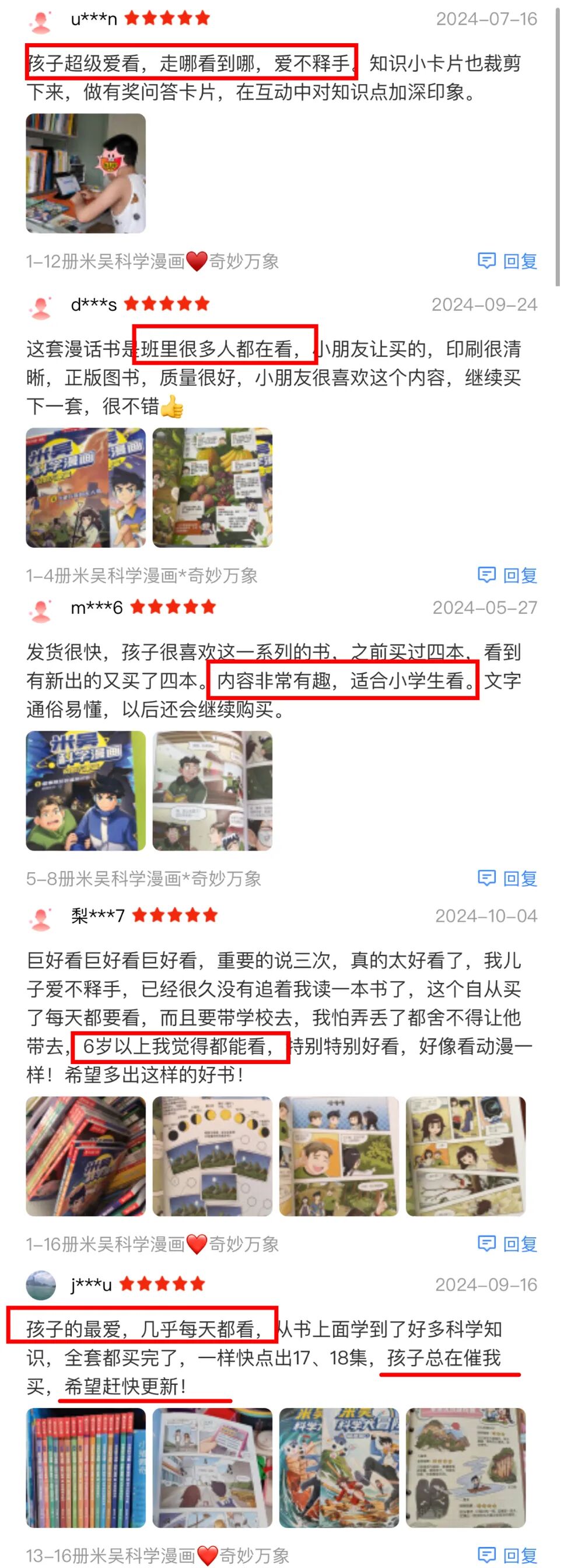 前段时间科技总裁马斯克的酷炫新品发布会,大家都看了吗。如果说这都是“毛毛雨”,那后面这些可以:带娃、遛狗、购物……的机器人,就真的让人震惊了~他们不仅情绪稳定,还精通各种技能,让无数网友直呼:好家伙~到底怎么做,才能把孩子培养适应未来时代的学霸、精英?一个15岁就被北大录取的成都男孩经历,就给所有家长提了个醒。他回答,就是通过北大最新的物理卓越计划考上的。从小学就对物理感兴趣,初一就考了年级第一。无独有偶~16岁在亚洲物理奥林匹克比赛上夺金的高二男孩蒲泊言。当别家孩子还在卷中高考,物理好的孩子被名校抢着录取。有远见的家长应该也能预测:未来10年20年,必定是科学人才大展拳脚的时代。如果不想让孩子被同龄人抛下,当下一个很紧急的事情,就是培养科学素养、物理兴趣。不过好多家长也很发愁:孩子就喜欢玩游戏、看电视、拼乐高……怎么才能把他们的注意力,转移到科学、物理、化学,这些高门槛的爱好上来呢?这让我想到全球科技大佬马斯克,就在采访中说,他从小就看科学漫画。可以说是科学漫画,启蒙了他的科学思维和缜密逻辑,才让他有了今天的科技帝国。没有孩子不喜欢看漫画书,而一套融入科学冒险、数理化知识的漫画书,如果你也想让孩子“无痛”学好数理化,从小养成“科学脑”。隆重推荐这套:上架1年,狂销250万册,无数家长直呼“买对了”的科学漫画书。就是你如果听孩子说:班上同学都在追一部科学漫画书,我也想看。支持孩子多看这样的漫画书,比其他科学百科书,都要丰富好读。确实。孩子喜欢才是硬道理!来看看这一水的好评,就知道买回家,孩子有多爱不释手。最近我们联系上了米吴官方团队,也给大家争取到了超值的价格机制!如果还是第一次听到这套书,也没关系,先花3分钟,给大家整体介绍下。它到底讲的什么,为什么受欢迎程度堪称“科学漫画中的名侦探柯南”?父母是参加保密科研的科学家,平时呢他就寄宿在同学安可菲的家里。哈哈,这既视感,像不像我们小时候的挚爱《名侦探柯南》故事开局。比如:一夜之间井盖全被偷了,城市楼顶突然发出强光……于是冒险小分队就集结出发了,一个个去探索、解决城市乱像、科学怪题。集热血、青春、冒险、推理……于一体。可以说各种元素都长在孩子的“心巴”上~因为它的重点,不是生硬地给孩子“灌输知识”,而重在打开孩子视野、启发思考。这是因为“水和空气中的氧气会令铁生锈,生锈的铁会变得很脆弱,所以随时可能会断。”可以说,都是孩子求知欲特别高、注意力特别集中的时候,穿插着给孩子科普。孩子不知不觉就在冒险故事中,get了数不清的科学小常识。既是一套培养孩子阅读兴趣的漫画故事书,也是一套丰富、奇妙、笑料百出的科学启蒙书。好多家长都是买过前面出的几册,所以咱们这次联系了米吴团队,也给大家争取到了超值的价格机制!第一辑(1~4册),第二辑(5~8册),第三辑(9~12册),第四辑(13~16册),新出版的第五辑(17~20册)适合之前买过的家长,现在孩子缺哪辑就买哪辑。每辑附赠知识大海报,并随机送出小象卡牌!全辑20册,官方价349元,我们只要299元!还有超多赠品,只有我们XX粉丝才有噢 !这款包包是非卖品,连米吴官方旗舰店都没上架!今天下单全辑20册就送!真的推荐还没读过米吴的孩子,一次集齐20册!一翻开就被吸引,“科学脑”疯长~6~12岁之间,想培养孩子科学兴趣,一定别错过米吴。就这么说吧,一年能卖10万册,已经是现象级畅销书。《米吴科学漫画》可以说是少年科普领域的王牌军,团队用实力证明:冒险故事+科学漫画,才是打破孩子与科学之间壁垒的一记重锤!科普大咖、知名儿童作家、少儿心理咨询师,以及游戏设计师。尤其是有了心理咨询师和游戏工程师的加盟,让这套书的故事都更加鲜活、有趣。就拿故事设定来说,科学冒险小团队就集齐了好几个性格鲜明的小朋友。有科学学霸、智慧担当,也有熟悉动植物的“小小博物家”。书中还有超多有代入感的场景,比如在学校上课、写假期作业的场景;更有电影大片里才有的情节,比如穿越密室里的红外线。6岁和12岁女孩从20册书中选出的“挚爱3本”吧,我自己也读了一遍。写得是真的好~比如第2本《珍奇生物的反击》,科学小队来到了珍奇生物展。我看的时候,有点意外。赶紧拿手机百度一下,发现现实中还真的有~就如书中所讲:“它是兰花中万中无一的珍宝,莲瓣兰品种的一颗明珠。”我读到这里真的有点震惊,这也太长知识了。难怪好多专业科普作家都说:这套书的含金量,真是儿童漫画书中少有的。它还巧妙利用科普动植物的方式,给孩子讲解五官生物知识:再看第5本《怪事频发的温泉民宿》,通过讲一个温泉民宿遇见的科学怪事。而从科学小队追捕“食热小象”的过程,顺手就给孩子科普了一个安全用电的常识。再来看看第13册《海湾城的科学奇旅》,相当于带孩子去野外学习求生知识。对培养孩子的逻辑思维、联想力,还有遇事积极开动脑筋的习惯,都有帮助。读过这套书,很多孩子已经不玩奥特曼卡牌了,都换成了米吴的小象卡牌~书中给孩子的线索是,需要找到满足两个条件的容器——相当于,一下子就把故事情节、科学常识,全都串联起来了。像这样又好玩、又长知识的互动游戏还有很多。1~20册,每册书都有。让孩子像玩游戏通关一样,在“抓捕科学小象