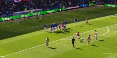 第64分钟,阿森纳获得距离球门20米处的任意球,赖斯右脚兜出精彩弧线球,做出神勇扑救。