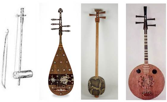 (1)五弦琵琶:颈项有直项、曲项的,音箱有半长梨形、半圆梨形、扁梅花形和扁圆形。
