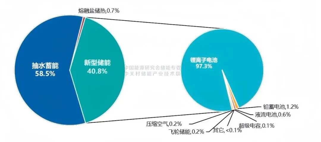 再看我国,截止到2023年3月底,国内已投运电力储能累计90.4GW,同比增长42%;新型储能项目快速增长,占比超过40%,锂电在新型储能中占比继续提升,超过97%;抽蓄首次降到60%以下(图5)。