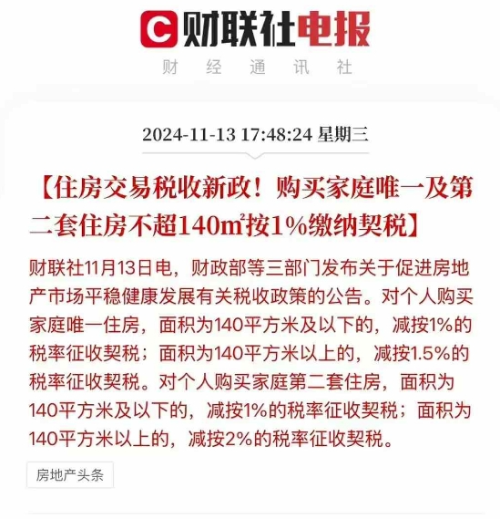 11月13日,财政部、税务总局、住房城乡建设部官方明确发布公告:调整后的契税政策为将现行享受1%的低税率优惠,面积标准由90㎡提高到140㎡。