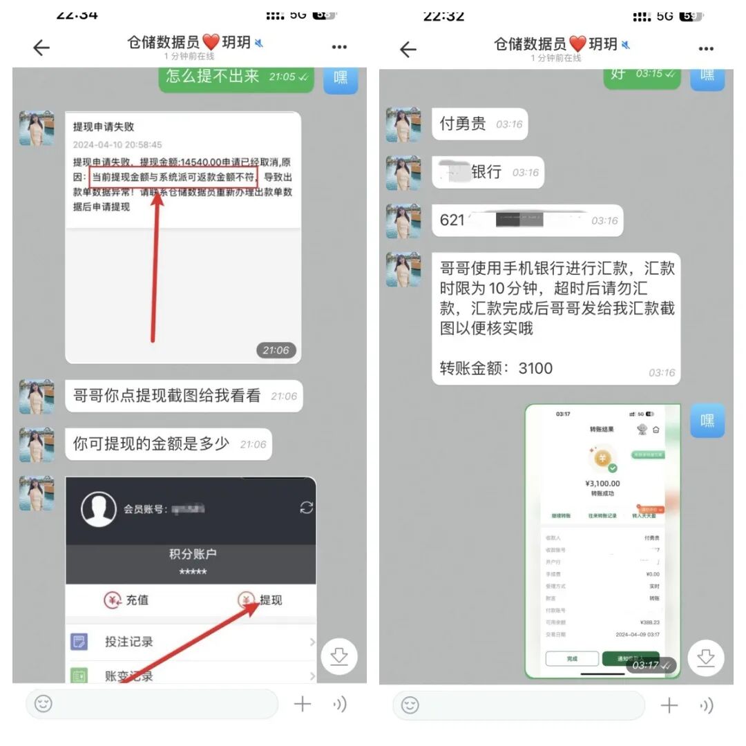 第二步:受害人表示想要“约炮”或者需要美女上门服务时,要求受害人注册“约炮”会员、完成刷单任务获得返利、缴纳安全保证金等理由进行充值、转账。