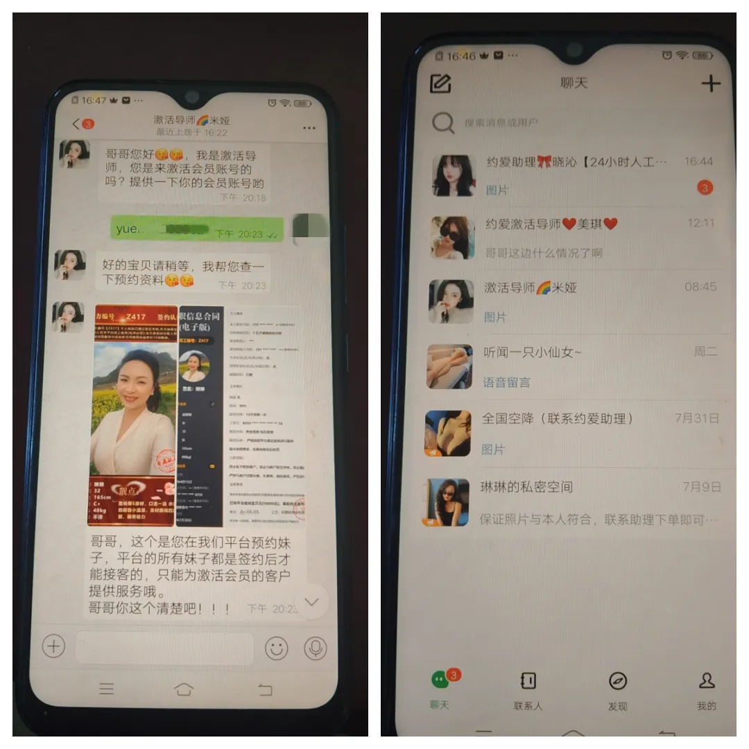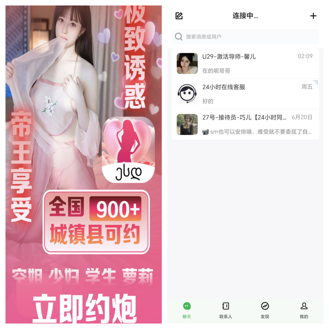 第一步:通过各种引流诱惑受害人下载陌生APP(如:在色情网站上投放招嫖广告链接或者通过地推人员发放涉黄小卡片,引诱受害人扫描小卡片上的二维码)。受害人下载完成后有所谓的“约爱客服”主动联系,发送可以提供“约炮”“全国空降”“同城上门服务”等色情服务的消息。(同步发送露骨美女图片或者色情小视频)