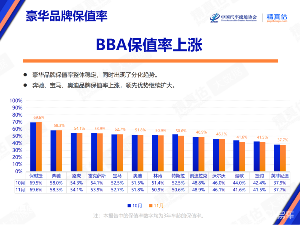 大家对品牌、售后服务的认可,加上买二手车没有后顾之忧,因此雷克萨斯的保值率在豪华车市场中一直名列前茅。根据中国汽车流通协会和精真估联合发布的《2024年11月中国汽车保值率研究报告》显示,雷克萨斯3年车龄的保值率为53.9%,位居豪华品牌保值率TOP4,仅次于保时捷、奔驰和路虎。